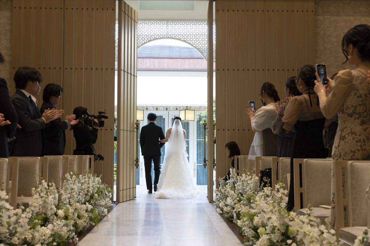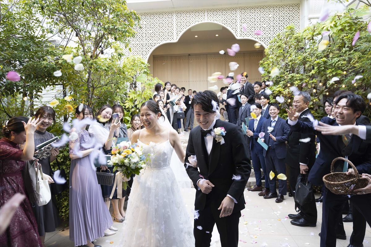 挙式のあとには、テラスでアフターセレモニーを行います!おふたりの美しい姿に綺麗なフラワー&フェザーシャワーがとっても映えます。