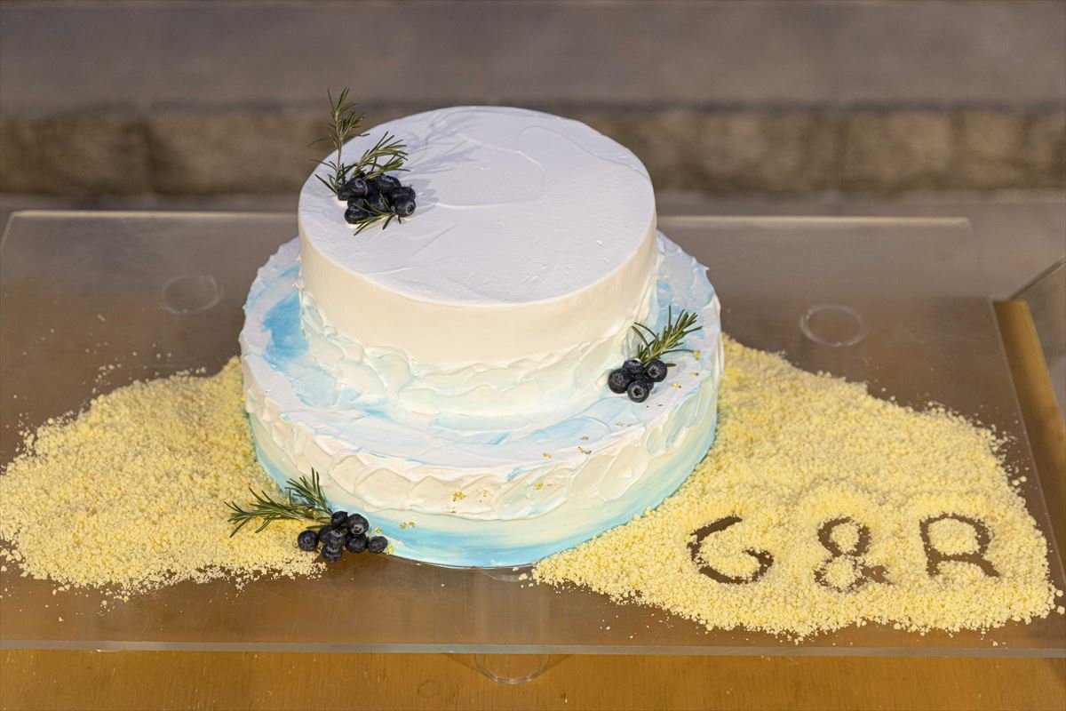 メインイベントのケーキセレモニーでは、鈴木キュイジニエからウェディングケーキのお届けです!鈴木キュイジニエとりささんは幼少期からのご友人で、3人で素敵なケーキを考えてくださいました。思い出デートの「金沢旅行」をテーマに金箔をちりばめて、ドライブした金沢の海を再現しました♪