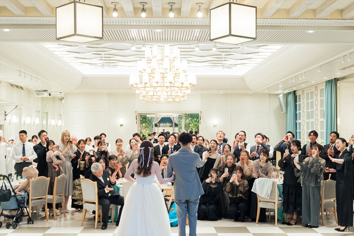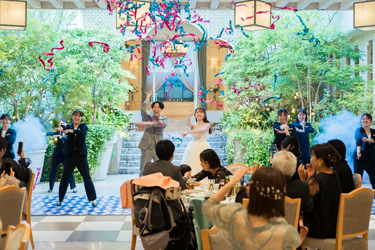お色直し入場では、【ドレスの色当てクイズ】を行います。まほさんのお衣装のお色味予想で、会場内がザワザワする中、カーテンが開くとお衣装チェンジされたおふたりのお姿が◎サビではブルーレマンスタッフと一緒にダンスし、おふたりからのメッセージ入りのテープシューターが飛び交います!この演出には今日一番の歓声が上がりました!