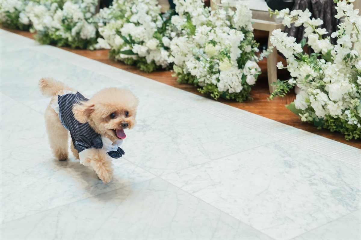 おふたりが選ばれたのは【人前式】。学生時代のおふたりをご存知のたくさんのご友人が集まってくださいました。親御様に身支度を整えて頂いてからのご入場、おふたりらしい誓いの言葉、ゲストの皆さまと完成させた結婚証明書。指輪の交換ではリングドックとして、まほさんのご実家の愛犬・プーちゃんに指輪を届けてもらいました◎