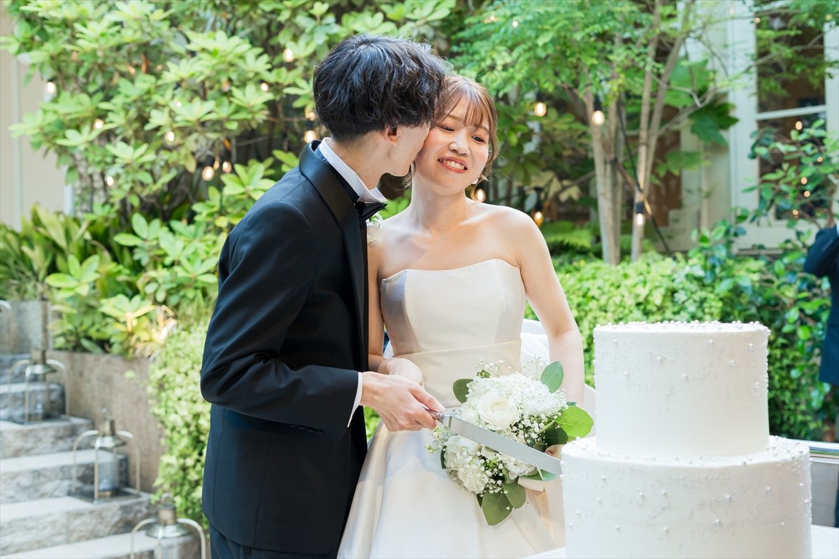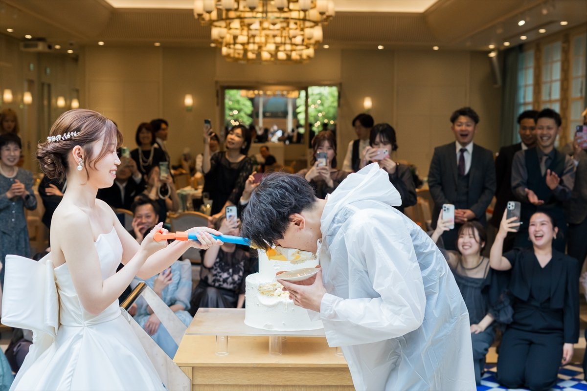 メインイベントのケーキセレモニーでは、まほさん監修の大人可愛いケーキにご入刀&ファーストバイトを行います。まほさんからは、とびっきりの愛情をたっぷり届けていただくため、かけるさんも準備万端!「あーん!」の掛け声で、パクッと食べていただきました♪